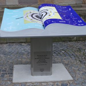 In Anlehnung an die "Bochumer Bücher", 50 Buchskulpturen, die zum 50-jährigen Jubiläum der Ruhr Universität Bochum an verschiedenen Orten der Stadt aufgestellt worden sind, hat Inge Brune für die Propstei Kirche ein Buch mit dem Titel "Heilen" gestaltet. Es verschränkt die Schöpfungs- und Heilsgeschichte mit der Biografie jedes einzelnen Menschen.
