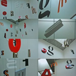 Werbebuchstaben / Logos bekannter Firmen an einem Gitter (4 x 4 m) hängend über den Besuchern